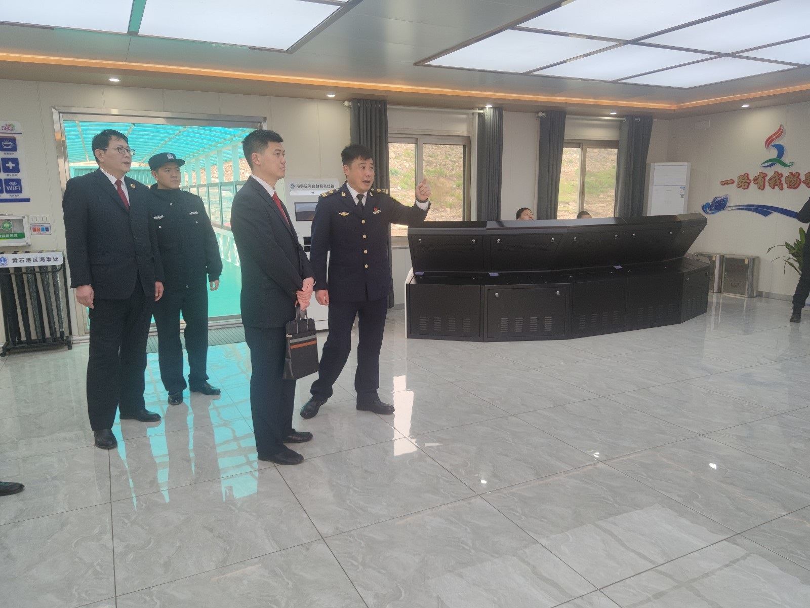 西塞山区法院环境资源合议庭法官袁德权、区检察院第二检察部主任王晓京等一行在黄石港区海事处处长汪海峰的陪同下,参观了海事处的党建中心及海事文化展厅,汪海峰详细介绍了海事处的工作职能以及长江西塞山段的相关情况,袁德权、王晓京分别就如何发挥审判、检察职能,贯彻实施长江保护法,共建山青水秀美丽西塞,与现场工作人员进行了深入交流。