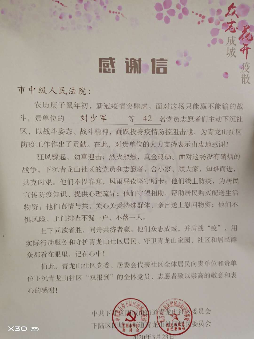 3月26日,青龙山社区第一书记饶芳带队来市中院感谢慰问。饶芳代表青龙山社区,对疫情防控期间法院给予的物质支持表示感谢,对下沉社区报到的法院干警、党员表示慰问。