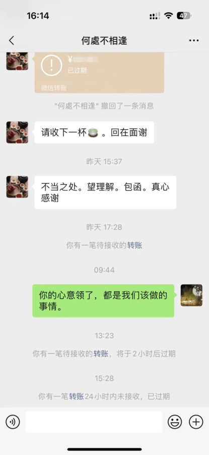 没过多久,我的手机里便收到何大叔的信息:请收下一杯茶,回再面谢。随后紧跟着就是一笔转账跃至眼前。