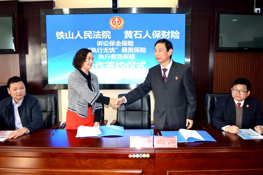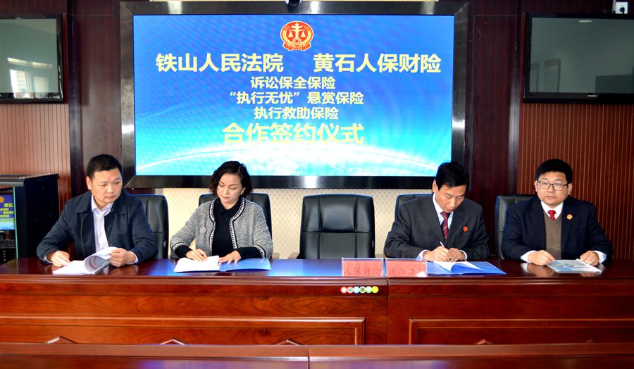 为了进一步推进基本解决执行难工作,全方面构建“执行无忧”的保险机制,铁山区法院与黄石人保财险签订合作协议,就诉讼保全保险、执行悬赏保险和执行救助保险进行深入合作和推广。