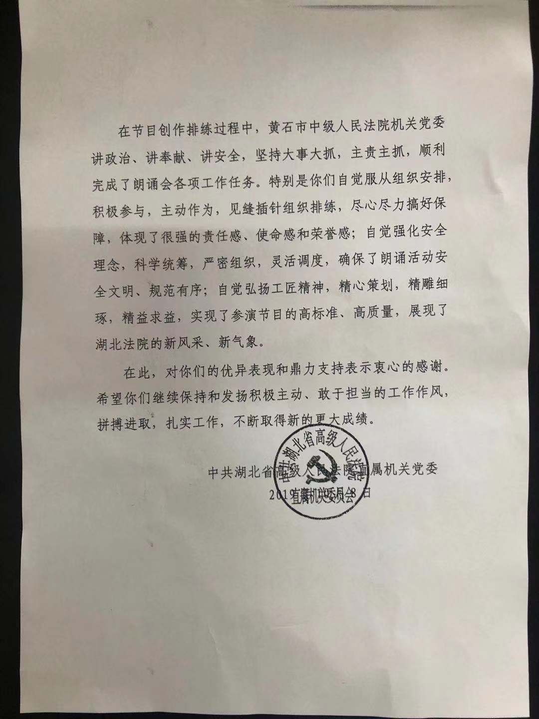 市中院机关党委在湖北法院庆祝中华人民共和国成立70周年朗诵会上因成绩突出受到通报表扬。